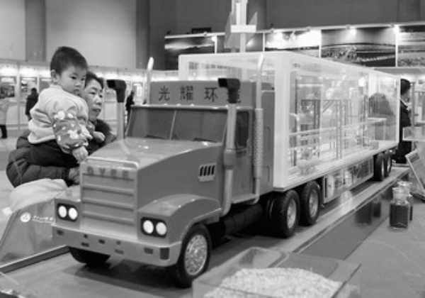 1月7日,观众在北京新农村建设展览会上参观车载移动式秸秆热解制油系统模型。
