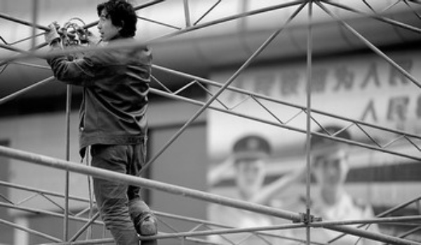 右图 1月7日傍晚,在贵阳火车站广场,施工人员冒着严寒加紧搭建临时旅客候车棚。