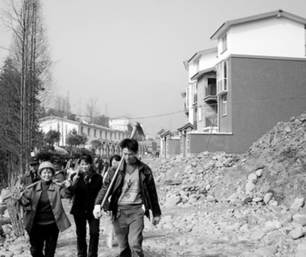 1月11日,施工人员走过位于都江堰市向峨乡棋盘村的永久性住房安置点。