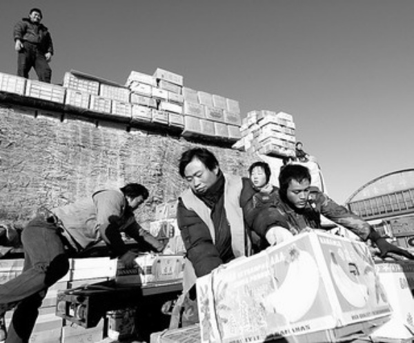1月12日,工人在北京新发地农产品市场搬运水果。