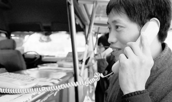 1月12日,一名旅客在合肥火车站广场拨打免费长途电话报平安。随着春运的开始,合肥火车站广场设立的免费电话“流动车”为旅客带来极大方便。 刘军喜摄(新华社发)