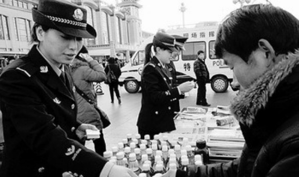1月12日,警察在北京站广场向旅客和商户发放警民联系卡,方便旅客报警和监督工作。 新华社记者 唐召明摄