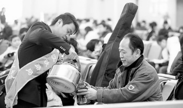 1月11日,武昌火车站一名工作人员在为旅客送水。当日,全国铁路春运正式启动,武汉铁路局组织广大党员、团员职工为旅客提供义务服务。 新华社记者 程 敏摄