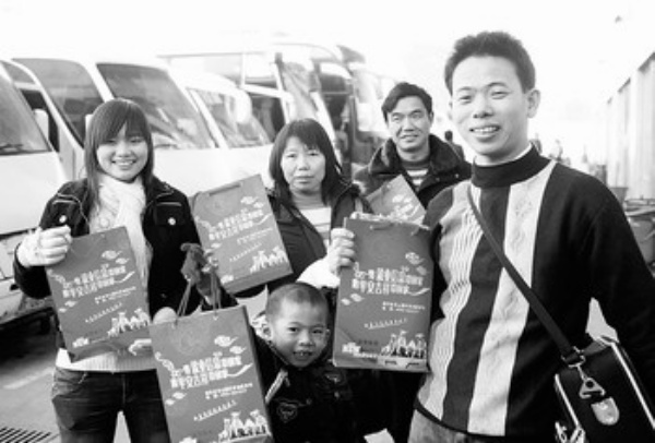 春运期间,江西南昌市青云谱区劳动就业局组织就业小分队,在汽车站将装有企业用工信息、技能培训信息和春联、矿泉水的大礼包免费发放给返乡农民工,帮助了解更多招工用工信息。