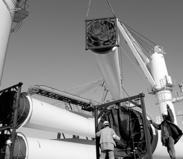 1月14日,一批由中国中材集团公司自主研发制造的风电设备从天津港装船运往印度。据了解,这批风电设备共30套,叶片长度达到40.2米,单机容量达到1.5兆瓦。扈 明摄(新华社发)