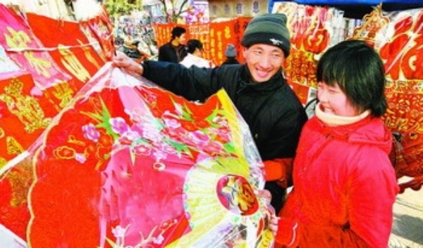 上图:春节临近,江苏赣榆县街头洋溢着浓郁的节日气息,商家备足了春联、年画等节日饰品供人们选购。这是人们在赣榆县沙河镇街头挑选年画。 司 伟摄(新华社发)