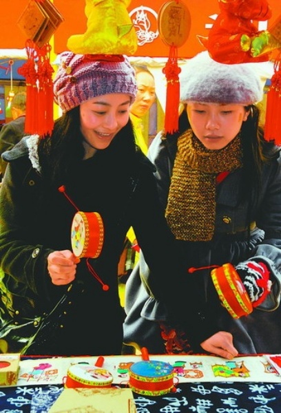 下图:“2009第八届中国·绵竹年画节”日前在震后的绵竹市举行。红红的灯笼,板房墙壁和其他地方无处不在的年画,让冬日的绵竹暖意融融。图为两位姑娘在选购年货。 新华社记者 陈 燮摄