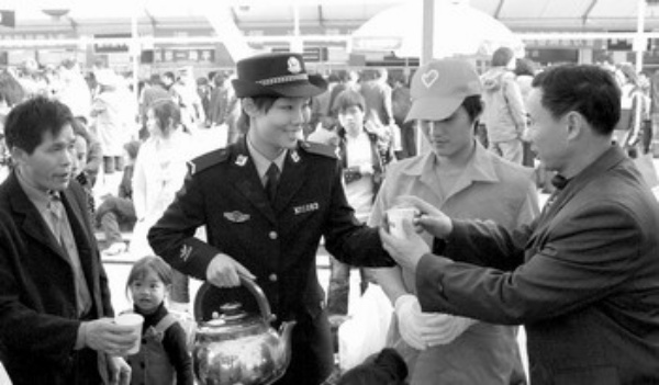 ②厦门铁路民警在厦门火车站为候车旅客提供茶水(1月14日摄)。2009年春运启动以来,厦门铁路警方开展“蓝盾”“铁鹰”行动打击各类犯罪活动,确保平安春运,并为旅客送温暖、送服务,努力营造和谐温馨的乘车环境。 新华社记者 项开来摄