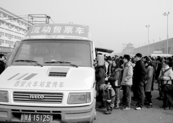 ③春运期间,各地铁路部门采取多种措施缓解旅客“买票难”。图为1月17日,旅客正在西安火车站站前广场的临时售票车前排队购买车票。 新华社记者 石志勇摄