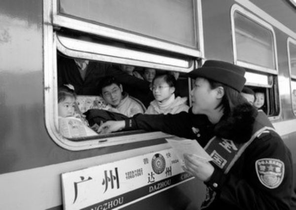 ④1月16日,一名民警正在给乘火车的旅客发放乘车安全提示宣传页。重庆铁路警方日前正式启动“暖春”行动,在火车站成立了“护送服务、换乘引导、法律咨询、应急医疗”小分队。 新华社记者 刘 潺摄