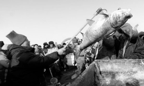 1月17日,渔工在活动现场捕鱼。 当天,一年一度的新疆乌伦古湖冬季捕捞活动拉开了序幕。近年来,乌伦古湖“冬捕”正以其原始古老而又独具特色的景观,成为新疆阿勒泰地区冬季冰雪旅游项目的主打品牌。 新华社记者 沙达提摄