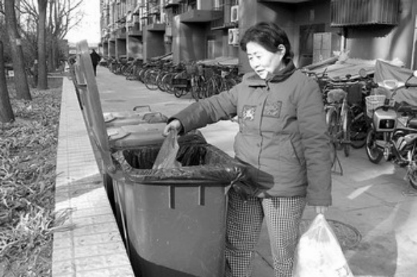 实行垃圾分类以来,居民已经养成了习惯。图为大乘巷居民仔细将分好类的垃圾投入对应的垃圾桶中。
