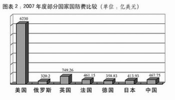 中国国防费总额、军人人均数额,仍低于世界一些主要大国的水平。2007年,中国年度国防费相当于美国的7.51%、英国的62.43%。军人人均数额是美国的4.49%,日本的11.3%,英国的5.31%,法国的15.76%,德国的14.33%。从国家国防负担的相对比例看,中国国防费仅占国内生产总值的1.38%,而美国占4.5%,英国占2.7%,法国占1.92%。