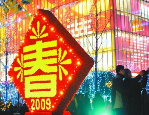 1月21日,两名市民在重庆主城一处“春”字灯饰旁拍照。