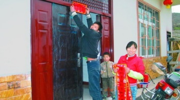 左图 1月20日,四川省汶川县漩口镇集中村羌族青年简巧军一家正高高兴兴地为刚建成的新家挂灯笼、贴春联。本报记者 钟华林摄
