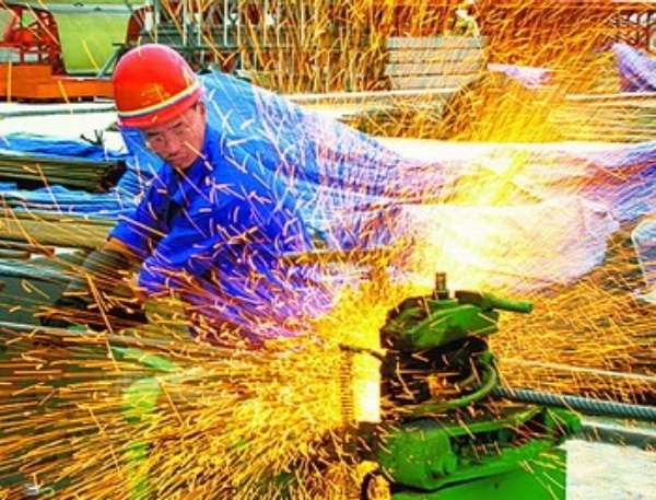 中国铁建二十三局员工正在进行轻轨PC梁的螺纹钢对接操作。