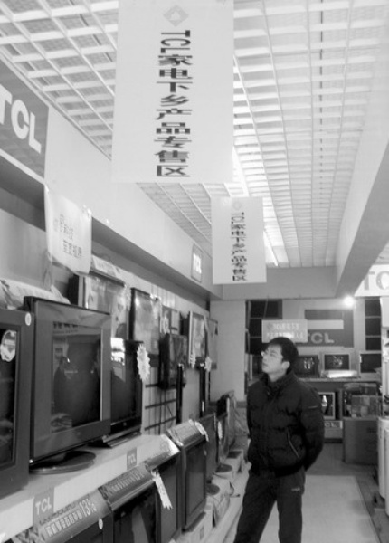 湖北省红安县一家TCL家电指定店开设了专售区,销售下乡家电。图为一名顾客正在选购彩电。