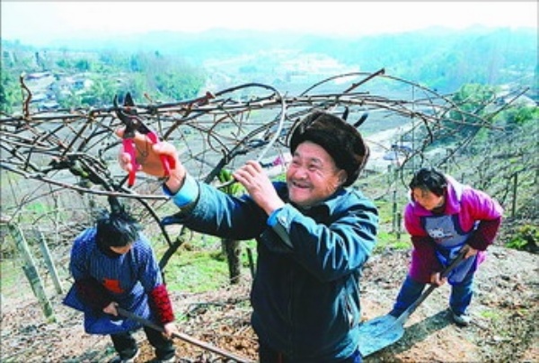 | 1月29日(农历正月初四),四川省都江堰市向峨乡红火村9组村民何顺德(中)一家人正在果园里修剪猕猴桃果树枝,他家种植的4亩猕猴桃年收入2万元。 |