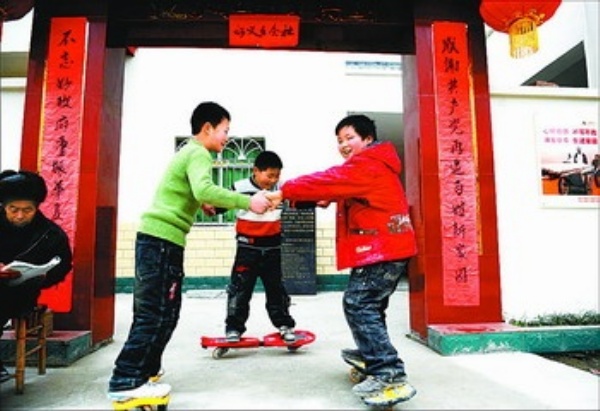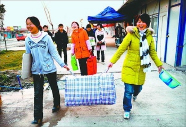 | 四川省绵竹地震灾区二号板房安置点,几名放寒假的学生高高兴兴地回板房安置点过年。在四川地震灾区各安置点,生活设施、管理措施愈加完备,使在这里过年的居民心情舒畅,气氛和谐。 |