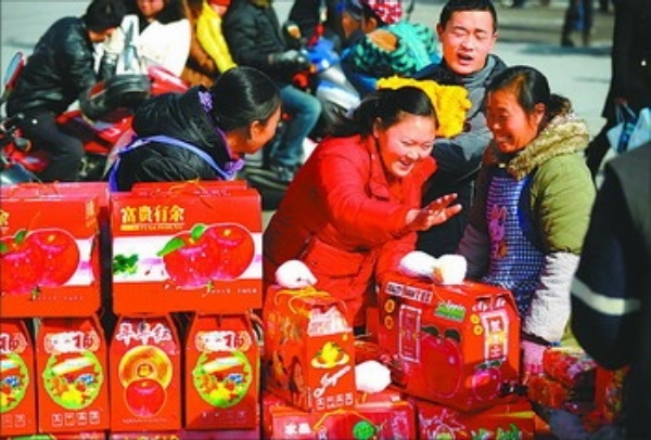 | 1月29日(农历正月初四),四川省都江堰市蒲阳镇互助村15组村民冯玉华(右一)在该镇繁华地段开办了一家水果、食品店铺,生意红火。 |
