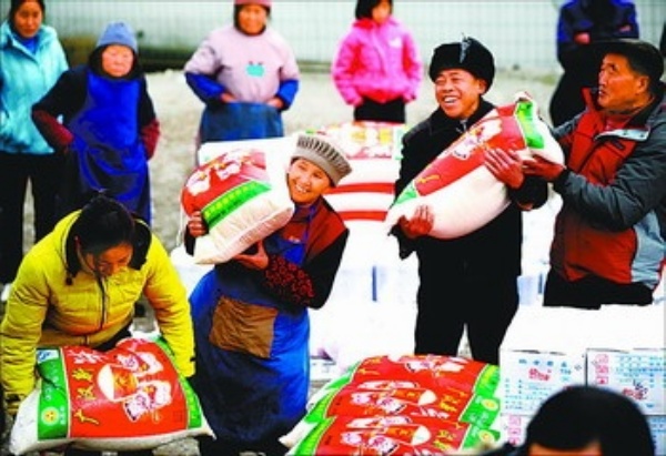 | 春节前夕,四川省都江堰市向峨乡海虹村4组的杨成英老太太(前左二)特别高兴,政府为地震重灾区群众专门拨发的过年救济粮油足额到户,大伙儿心里踏实极了。 |