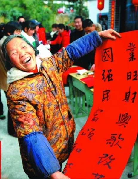 | 为迎接新春佳节,四川省都江堰市向峨乡棋盘村第7组村民贾正英赶往乡村大集,请人写了最能表达心情的春联。去年大地震这里是重灾区,在党和政府的关怀下,在全国人民的支援下,灾区群众迅速恢复生产,重建家园。如今这里到处欢歌笑语,气象一新。 |