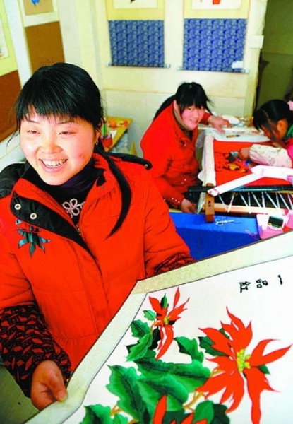 春节期间,四川绵竹遵道镇棚花村,陈彬(左)正在介绍年画刺绣。绵竹年画知名度很高,是国家非物质文化遗产,年画销往多个国家和地区。 本报记者 李景录 李江天摄影报道