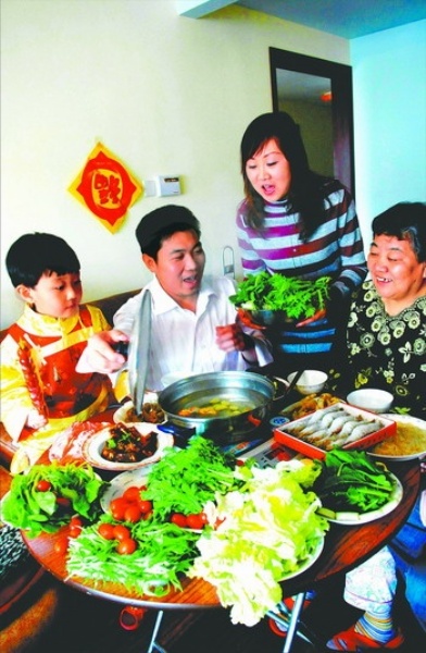 年三十的团圆饭是最热闹的,家住北京花乡的市民张书晓(左二),特地从超市买来丰盛的肉、虾、蛋、菜涮火锅,一家人热热闹闹地团聚,热热闹闹地过年。 本报记者 赵 晶摄