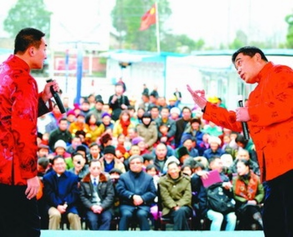 文化部春节赴灾区演出小分队在四川崇州市街子古镇安置点演出。本报记者 李景录摄