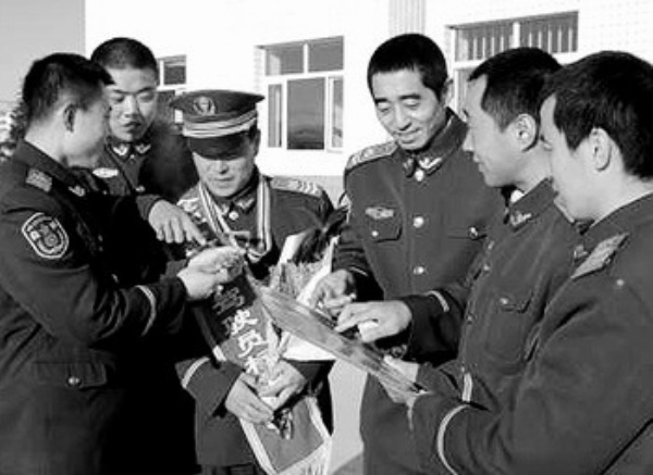 上图 大兴安岭地区森林支队五级士官于连合近日被解放军四总部授予“红旗车驾驶员”标兵,他正与战友们一起分享获奖喜悦。 王齐胜摄