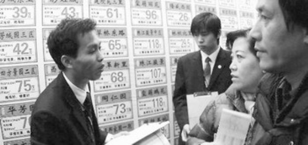 图为北京西大望路的一家房屋中介机构业务员在向客户介绍二手房情况。