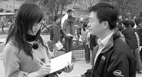 本报记者现场采访正在组织孩子们活动的英特尔公司的志愿者。 本报记者 李国章摄