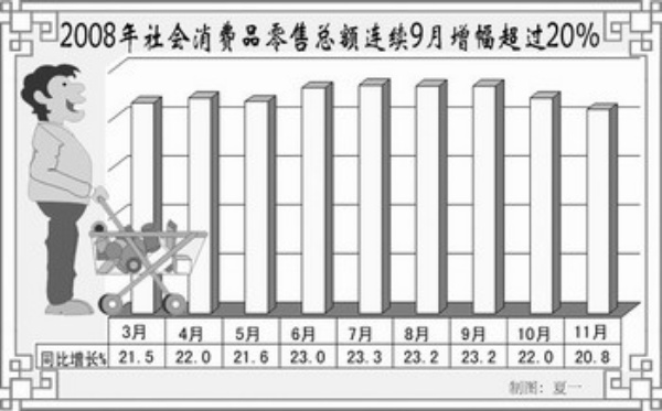 此外,高物价也在一定程度上抬高了零售额名义增幅。2008年下半年,尽管物价快速回落、呈下行趋势,但全年商品零售物价指数(105.9%)仍创下1997年以来的新高。物价高位运行直接助推了零售总额名义增长速度,2008年由于商品零售价格上涨,拉升社会消费品总额6.8个百分点。
