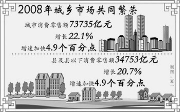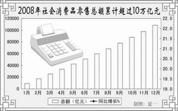 2008年,在经济增速减缓、各种不利因素交互作用的情况下,消费品市场继续保持了平稳活跃的运行态势,全年社会消费品零售总额突破10万亿元,增速也创下了1996年以来的新高,这是我国2008年经济社会发展中最振奋人心的一个亮点,也是多种因素共同支撑的结果。