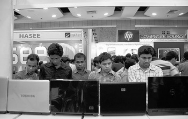 2月4日,在孟加拉国首都达卡,几名男子在笔记本电脑展上参观。当天,孟加拉国举办笔记本电脑展,共有13个国际品牌参展。随着笔记本电脑价格的下降,孟加拉国使用笔记本电脑的用户正逐年增加。新华社发