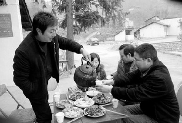 1月25日(农历大年三十),记者夏先清(右)与四川省青川县黄坪乡枣树村自立自强的残疾人夫妇石光武、张正芳一家人吃团年饭。