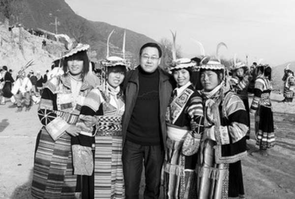 1月26日(农历大年初一),记者李琛奇(中)在海拔2000多米的甘肃省文县铁楼乡麦贡山采访,与四位白马藏族姑娘合影。