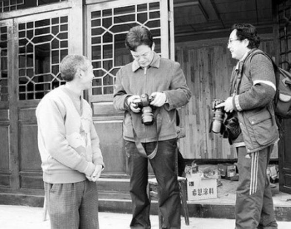 1月25日(农历大年三十),记者李景录(中)和李江天(右)在四川省绵竹市遵道乡棚花村采访村民王正贵。