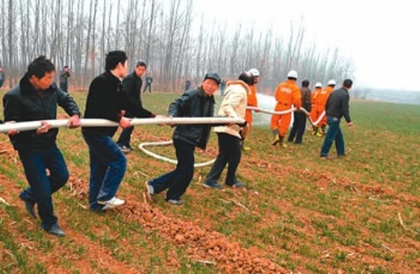 2月6日,洛阳农民自发帮助消防队员拉水管给麦田喷灌。洛阳市每日出动38辆消防车、投入消防官兵1600人次,计划每日运水2700吨,日喷灌670亩麦田。 郭莎莎摄(新华社发)
