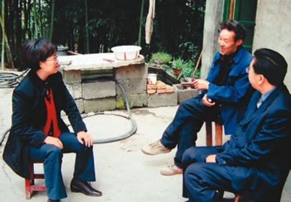 二○○六年十月,王瑛(左)在南江县杨坝镇尖山村与群众座谈,商讨致富之策。         新华社发