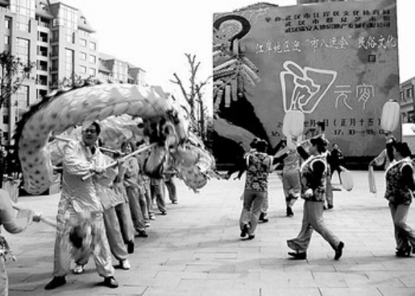 2月9日,在武汉市新天地社区,人们用舞龙灯、耍狮子、跳彩船等丰富多彩的民俗活动喜庆元宵佳节。本报记者 郑明桥 通讯员 杨 鹏摄影报道