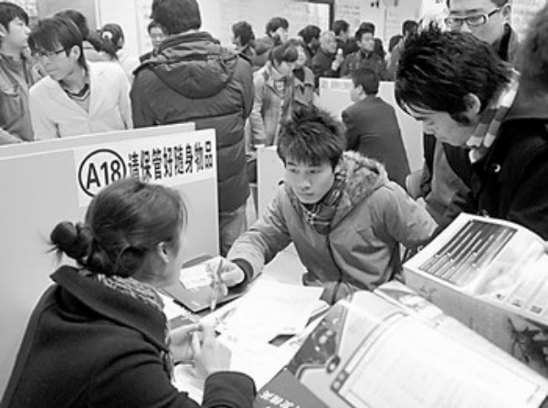 2月3日,武汉市新春首场招聘会在武昌阅马场起点人力资源市场和江岸区人力资源市场同时举办,由此拉开武汉市新春系列招聘活动的序幕,之后该市将有多场新春招聘会陆续举办。今日两市场提供岗位1.2万多个,涵盖70多个工种。上图为一名应聘者(中)在与招聘人员面谈。 新华社记者 程 敏摄