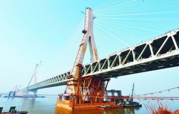 2月9日,武汉天兴洲公铁两用长江大桥首条货运铁路线全线铺通,为大桥2009年6月底通车奠定了坚实基础。新华社记者 杜华举摄