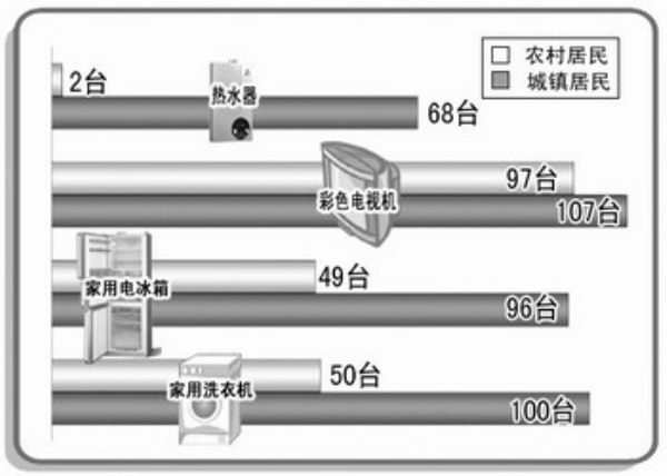 呼市城乡居民家电产品每百户拥有量差距不小,这说明,一、二级市场日趋饱和的今天,农村市场潜力巨大。