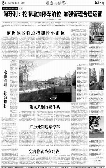 以布达佩斯为例,在市中心区域的各主干道路、单行线上的停车泊位都进行了标示,对禁止停车、临时停车地段也进行了明确标示,对地上、地下停车场的位置也给出了醒目的指示。此外,在匈牙利国会、总统府、总理府、各政府部门、布达佩斯市政府各部门及外国驻匈使领馆门前都规划出只有持有许可证、或者是外国驻匈使领馆行车牌照的汽车方可停车的“专用车位”。对于违章在主干街道停车或者占用专用车位停车的车辆,重则被拖车强行拖离,拖车费加行政罚款至少3万福林;轻则被“车轮锁”锁住,在车主交纳罚金后,40分钟之内将车解锁。被“车轮锁”刚刚锁住,车主见到了尚未开具罚单的管理人员,须现场交纳6000福林解锁;车主发现被别在挡风玻璃雨刮器上的罚单后,到指定地点在24小时内交纳,罚款金额还要增加,三天之内交纳,罚款金额是16000福林,三天以上交纳,罚款金额还要增加。对来匈牙利进行旅行的外国汽车,对其乱停车及未交停车费的行为,也将使用“车轮锁”,以保证其在离开匈牙利前交纳罚金。