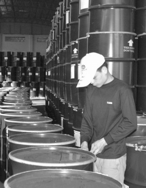 广西合浦“果香园”是全国最大的热带水果浓缩汁生产出口企业,每周检验出口的浓缩菠萝汁达200吨。图为一名工人正在检查罐装浓缩菠萝汁,这批产品即将出口到欧洲。新华社记者 梁思奇摄