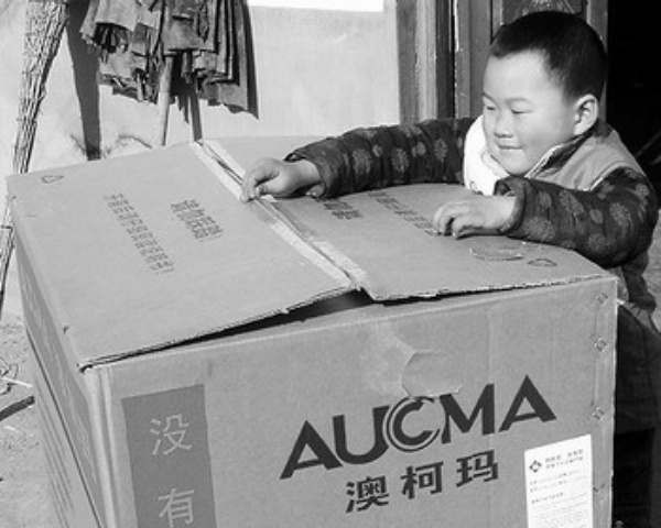 上图 山东省平度市柳林村6岁的王耀飞抱着新买的冰柜喜笑颜开。摄影/黄 鑫