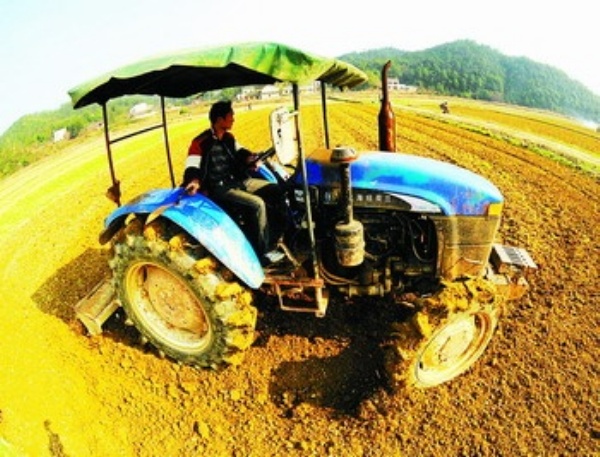 2月12日,农民驾驶耕整机在湖南长沙县田间作业。