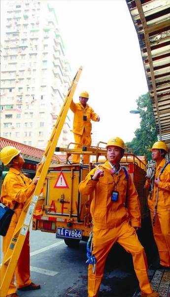 广州市供电局抢修队职工正在抢修作业。为方便居民,广州市供电局开设抢修热线,24小时待命,随时处理线路故障,保障了百姓正常用电。