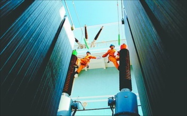 右图 深圳220千伏甲岸变电站的职工进行维护作业。该电站的建成,有效改善了深圳电网的供电能力,为深圳的经济发展提供了电力保障。